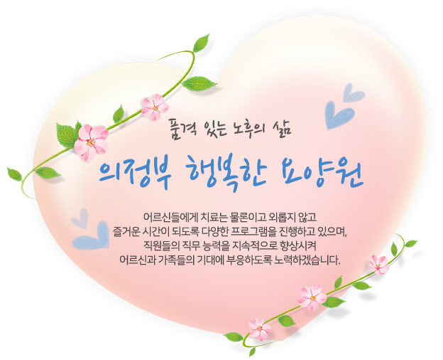 존중가치 실현! 품격있는 노후 삶 추구! 시설소개 요양원갤러리 찾아오시는길 HAPPY LIFE with happysilvercenter여러분과 함께 최선을 다해 만들어 가겠습니다. 입소안내More View 온라인입소상담신청More View 공지사항More View Q & AMore View 이용후기More View 나눔과 섬김이 있는 공동체 생활이곳은 의정부행복한요양원입니다. 프로그램활동 산책활동 일상활동 예배서비스 영양관리 의료서비스 고객센터의정부 행복한 요양원은 여러분을 기다립니다.031-841-6221031-841-6227 팩스 031-841-6222 월~금요일 09:00 ~ 18:00 점심시간 12:00 ~ 13:00 동물농장~ 실외환경 건물 외부전경 실내전경